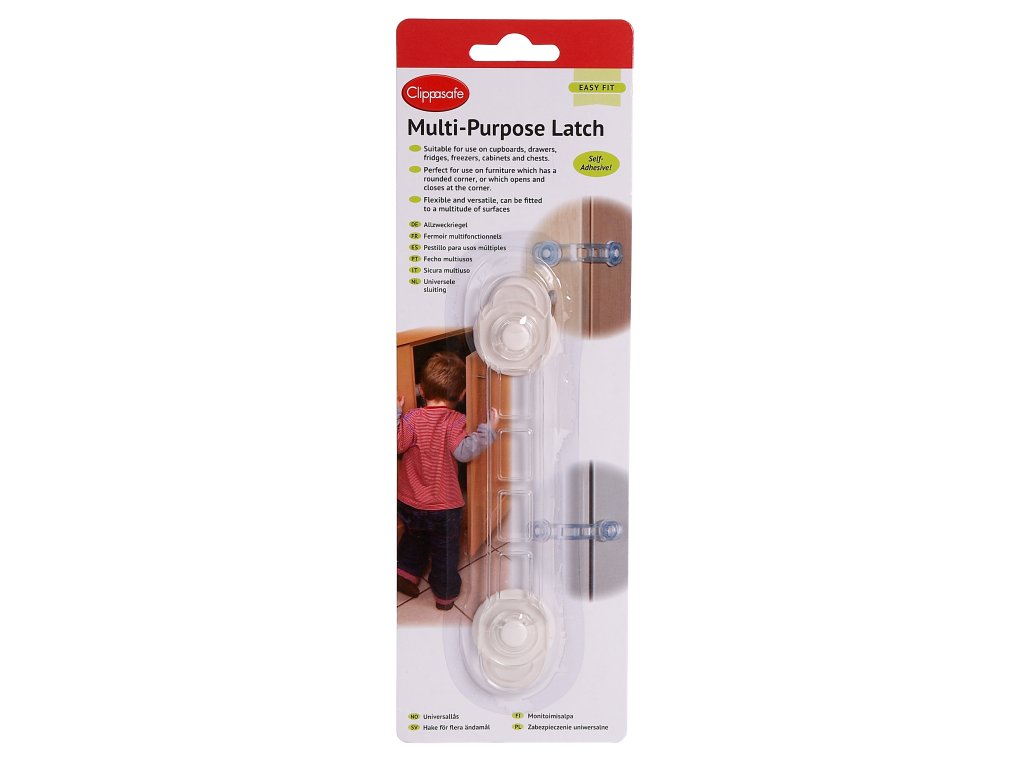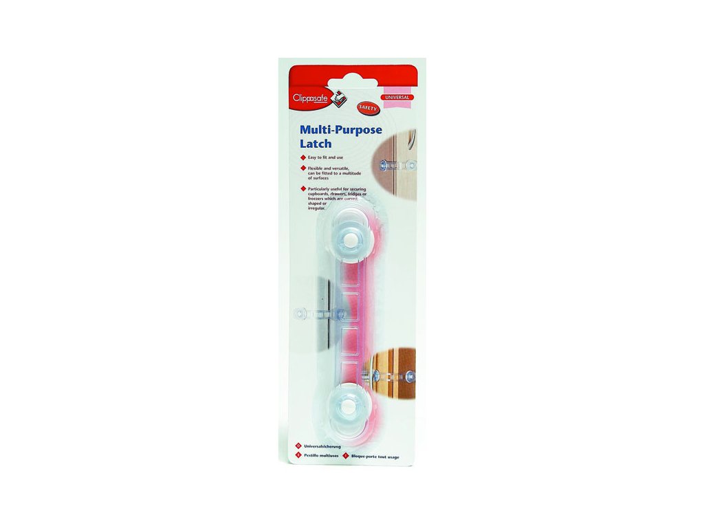 Víceúčelová pojistka Clippasafe je snadno použitelná a pomáhá zabránit dětem otevírat skříně, zásuvky, lednice, mrazáky, skříňky a bedny.
