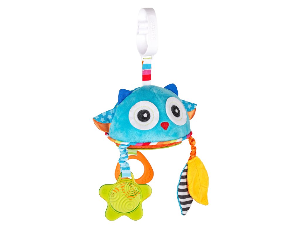 Tato roztomilá barevná hračka rozvíjí jak motorické, tak senzorické dovednosti miminka. Hračka má několik částí, přičemž každá je vyrobena z jiného materiálu, má jiný tvar a funkci. Děti na jedné hračce najdou zrcátko, šustivé listy nebo kousátko. Zabaví se tak objevováním barev, tvarů, textur a zvuků. Klip zajistí, že hračka bude vždy směřovat k dítěti. Lze ji připevnit na hrazdy, kočárky, dětské sedačky, postýlky a další. Vhodné od narození.