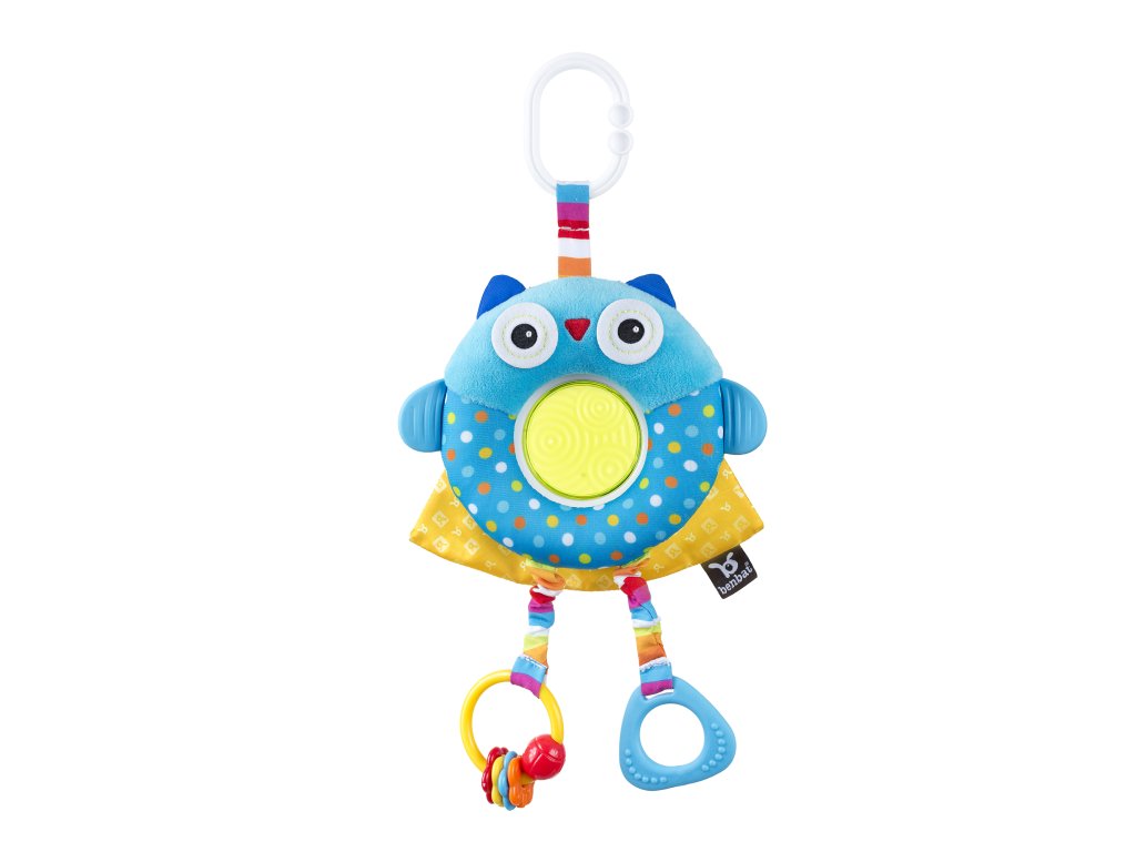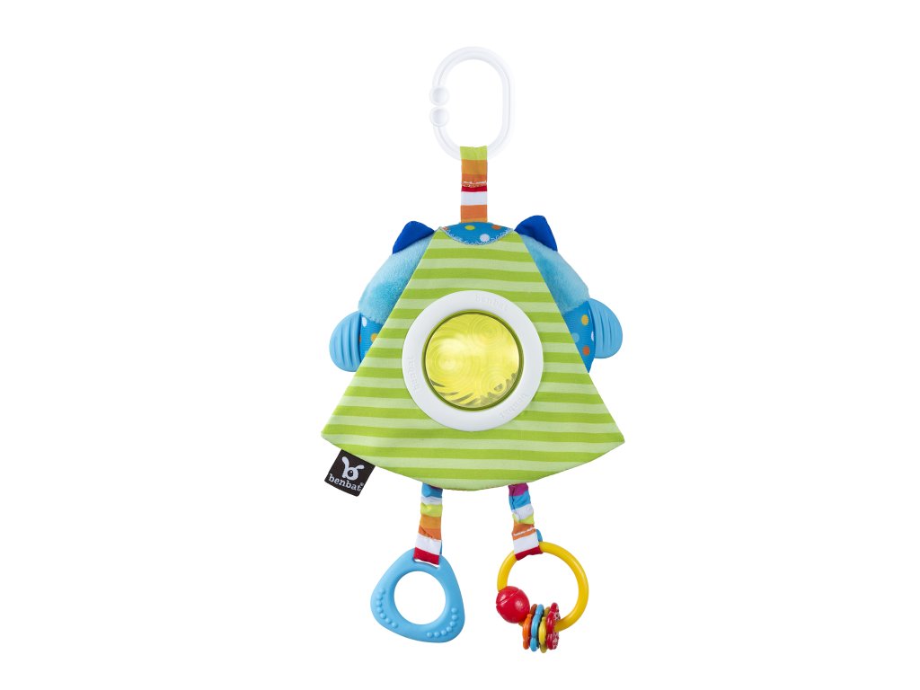 Světlé barvy, roztomilý, plyšový zvířecí kamarád, stuhy a chrastítka budou děti nejen bavit, ale zároveň rozvíjet jejich psychomotorické dovednosti. Chrastítko v bříšku plyšového zvířátka učí dítě zaměřit a identifikovat zvuky, pohyblivé části trénují koordinaci “oko - ruka”. Snadno upevnitelný klip ke kočárkům, autosedačkám a dalším zajišťuje, že hračka bude vždy směřovat k dítěti. Plastové části neobsahují BPA. Vhodné od narození.
