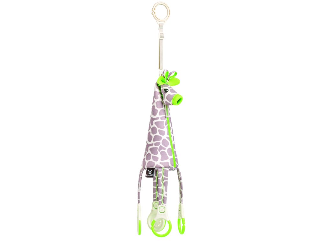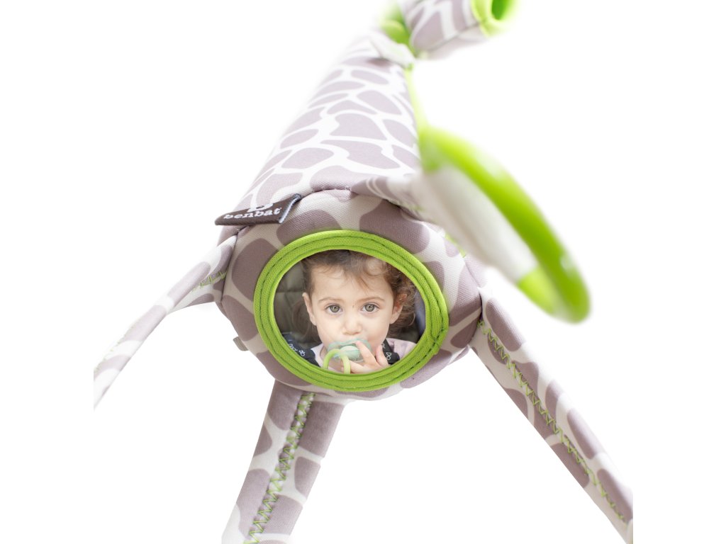 Hravá žirafa poslouží nejen jako hračka, ale také jako praktický organizér. Díky 4 bezpečným háčkům lze na žirafu připevnit například oblíbenou hračku, muchláčka nebo jiné věci, které dítě potřebuje mít vždy po ruce. Praktická kapsa v bříšku žirafy poslouží k uschování dudlíku nebo malé svačinky. Zrcátko zabaví děti na dlouhé minuty.