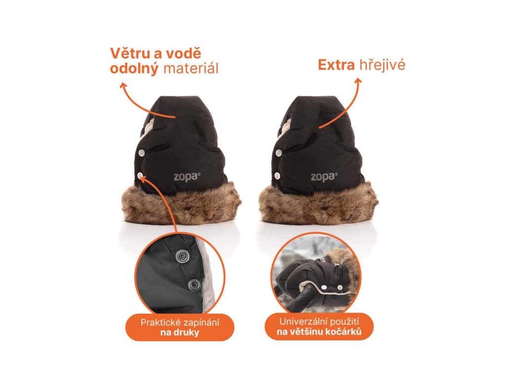 Hřejivé rukavice, které pasují na všechny typy kočárků. Jsou ve stejném designu a barevném provedení jako fusak Fluffy Combi, takže tvoří stylový set. Snadno se zapínají pomocí praktických druků.