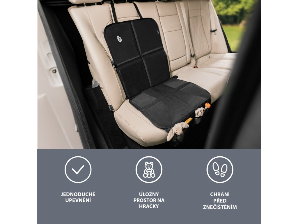 Praktická ochrana sedadla pod autosedačku ZOPA je užitečná pro každého rodiče, který chce své auto udržet v čistotě a ochránit ho před možným poškozením. Sedadlo auta chrání před nechtěnými skvrnami a rozlitými tekutinami. Kromě praktické funkce plní i užitečnou, síťované kapsy ve spodní části ochrany sedadla jsou vhodné pro uložení hraček, svačiny, či jiných drobností, které během cesty dítě využívá. Je vyrobena z odolného a omyvatelného materiálu. Je designovaná tak, aby se vešla mezi bezpečnostní pásy vozidla. Na sedadlo se upevňuje pomocí praktického pásu na klip.